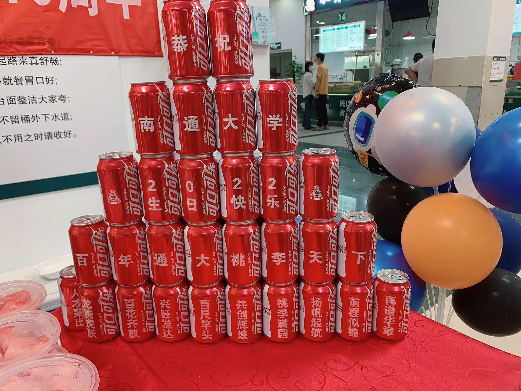 食堂大厅,在出入口门的内侧,各布置一张餐台,各准备一组定制logo的可乐,同时餐台上准备丰富的水果拼盘、酸奶、饮料免费赠送给就餐的师生员工。水果采取一人一份独立包装的方式。东西大厅餐台左右两侧各一组装饰气球,餐台后方悬挂红色横幅,并题字“热烈庆祝南通大学110周年校庆”