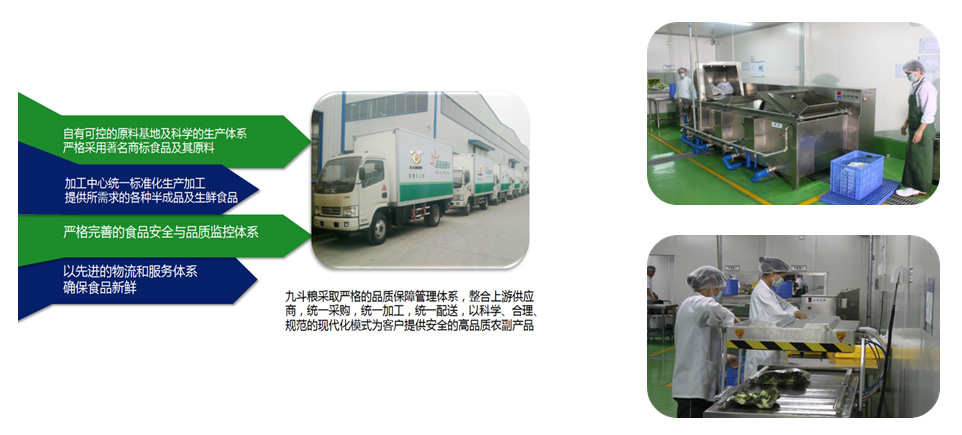 九斗粮餐饮集团建立了现代化的生鲜物流分拨中心、食品加工中心和生鲜冷链物流系统一体化结合的物流体系,在食品加工过程中完善结合高科技术,建立一个从原料生产、加工再到市场服务的高效率网络。